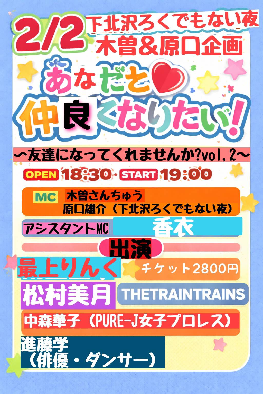 アインズグループのブレンダVIP東京に所属する最上りんくさんが「下北沢ろくでもない夜 友達になってくれませんか? Vol.2」への出演が決定致しました。