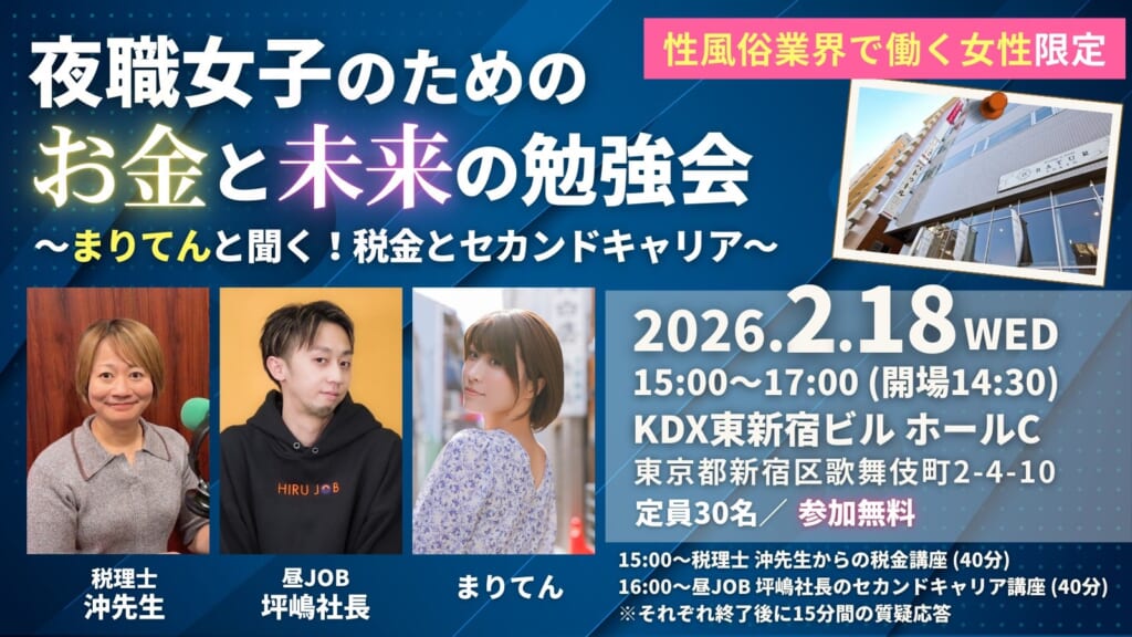 昼JOBの坪嶋社長、税理士の沖先生が出演されるこのイベントでは、昨年の引退以降も様々な活動を精力的にこなすまりてんさんと共に、夜職女子が気になる”お金”と”未来”のことを質問攻めにできる勉強会になっています。