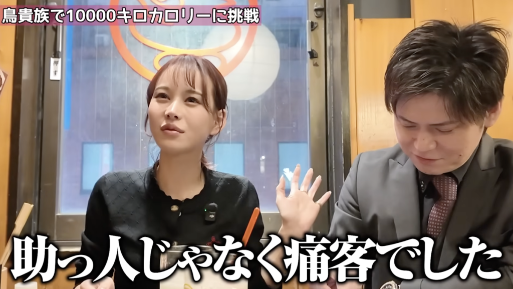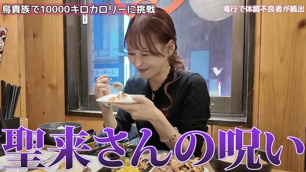 本人いわく特技は「人を落とすこと」だが、実は隠れた一面として“驚異の大食い”だそうです。過去にはなんとたこ焼き98個、餃子102個を完食した経験もあるそうです。そんな聖来さんに与えられた今回のミッションは、鳥貴族で10000キロカロリーを食べ切るというハードな挑戦でした。