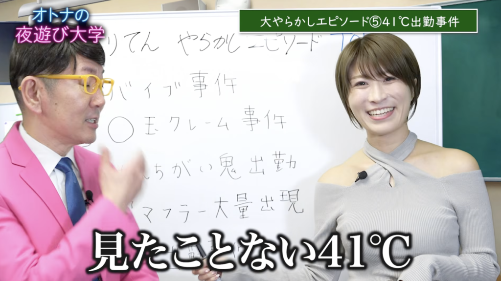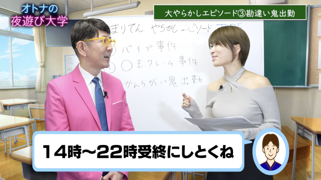 伝説の”1万回抜いた嬢”ことまりてんさんが「オトナの夜遊び大学」にコラボ出演し、自らの黒歴史を初公開!まず一つ目は、デビュー4年目のベテラン期にビジネスホテルで遭遇した恐怖体験です。お仕事バッグに、オプション用のバイブをむき出しのまま放り込んでいたというまりてんさん。いつものように本指名のお客さんと合流し、エレベーターに乗り込んだところ、バッグの中のバイブがまさかの起動!他のお客さんも同乗する密室空間で「ブブブブブッ」と鳴り響くバイブの音…隣のお客さんはジリジリと距離を取り、知らないふり。8階まで耐え抜いたというこの事件、想像を絶する冷や汗ものの状況に、聞いているこちらも背筋が凍ります!