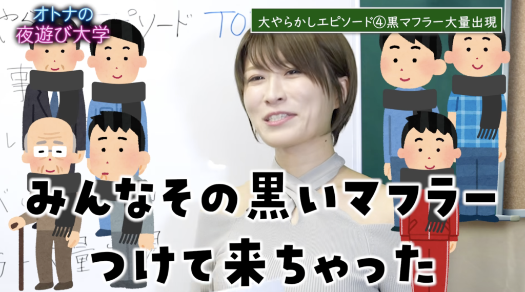 YouTuberとして活動を始めて間もない頃、初めてのオフ会がクリスマス明けに開催されました。応援してくれるファンは、以前からの「太いお客様」がほとんど。当時多忙だったまりてんさんは、複数のファンに同じブランドの黒いマフラーをプレゼントしました。そして迎えたオフ会当日、会場には彼女がプレゼントした黒マフラーをつけた男性たちがズラリ!「偶然…にしては多いな」と感じつつも、その場は無事に乗り切ったそうです。しかし、もしプレゼントが赤いマフラーだったら…と考えると、ゾッとしますね。この経験から、プレゼントは一人ひとりに合わせたオリジナルを贈ることを心に誓ったそうです。