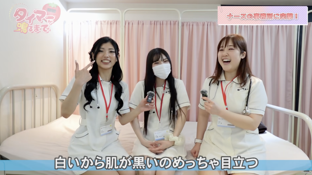 いよいよ二人がナース服に着替え、診察室へ!白いナース服を着ることで、タキナさんの肌の黒さが際立ち、よりセクシーな雰囲気に(笑)。元看護師のさきさんは、聴診器の扱いも手慣れた様子で、まさにガチのナース姿!ゆうりさんが聴診器を使い、脈拍測定から問診、身体検査までの流れを実演。診察室で実際に使用される聴診器は本物で、そのリアルな響きにさきさんは「ドキドキする!」と興奮を隠せません。患者さんの要望に応じて多様な使い方ができることや、中には「○水を飲みたい」というM気質の患者さんもいるという驚きの情報も明かされ、その多種多様なサービスに一同、感嘆のため息!